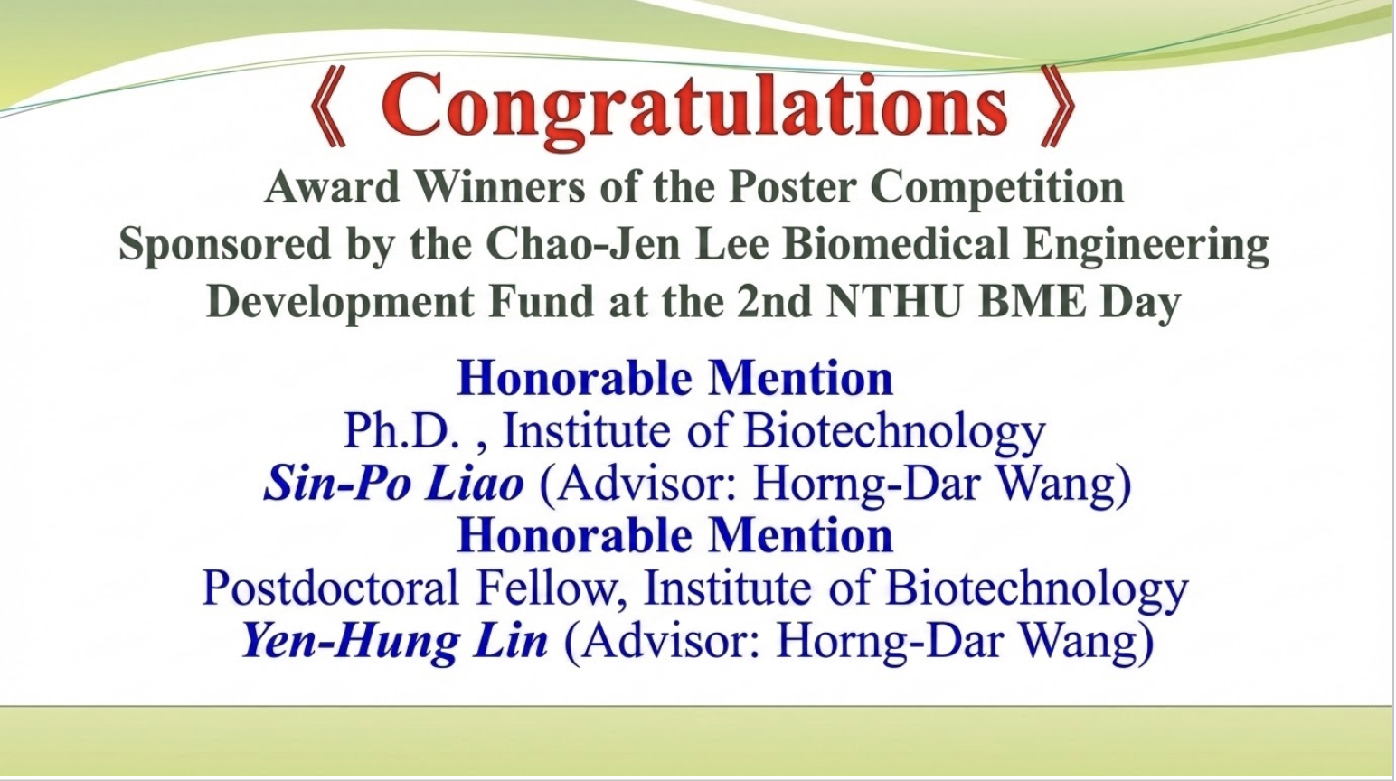 Award Winners of the Poster Competition Sponsored by the Chao-Jen Lee Biomedical Engineering Development Fund at the 2nd NTHU BME Day