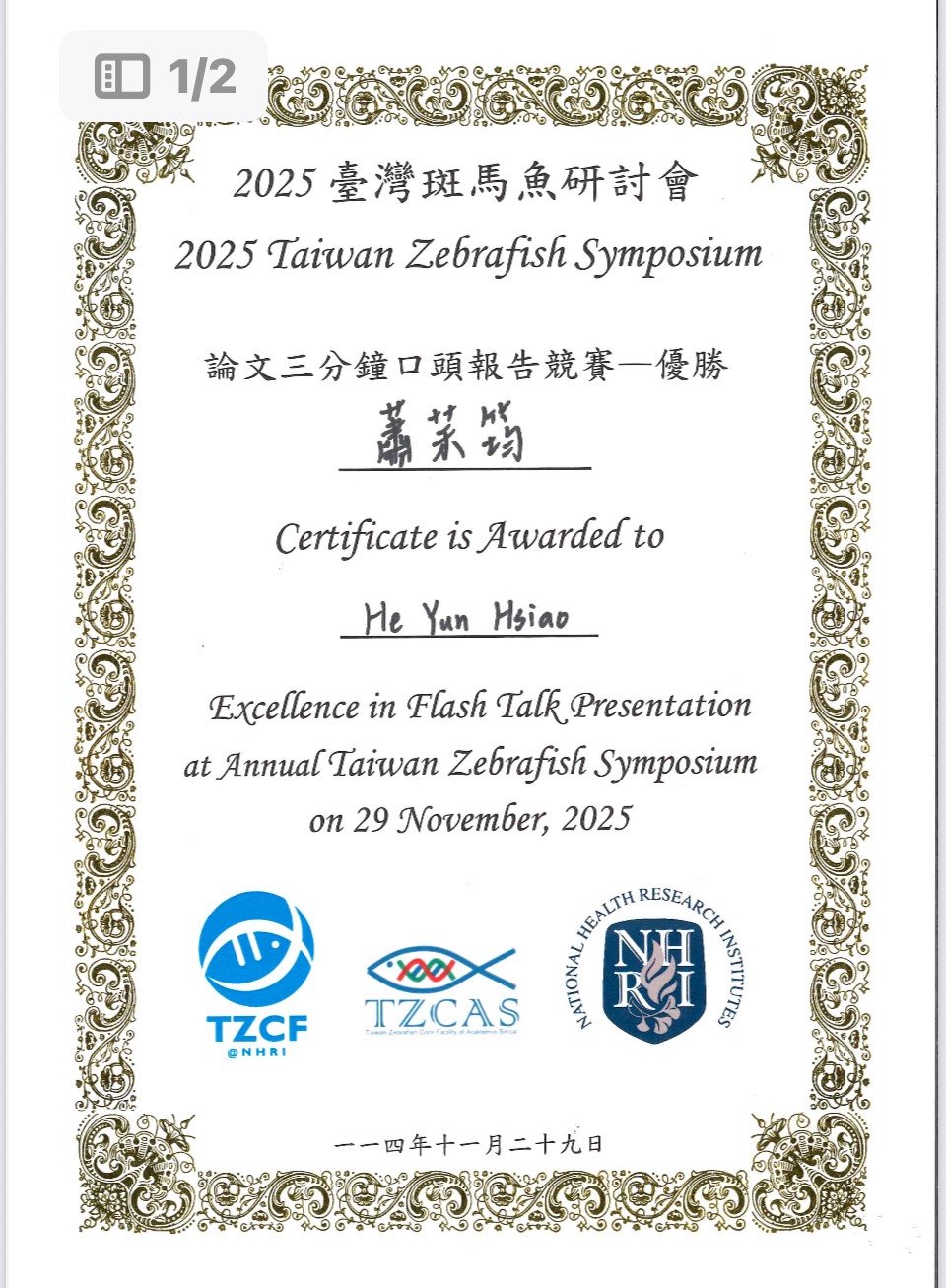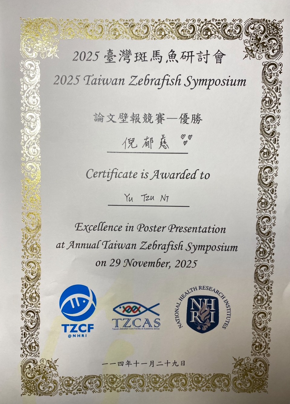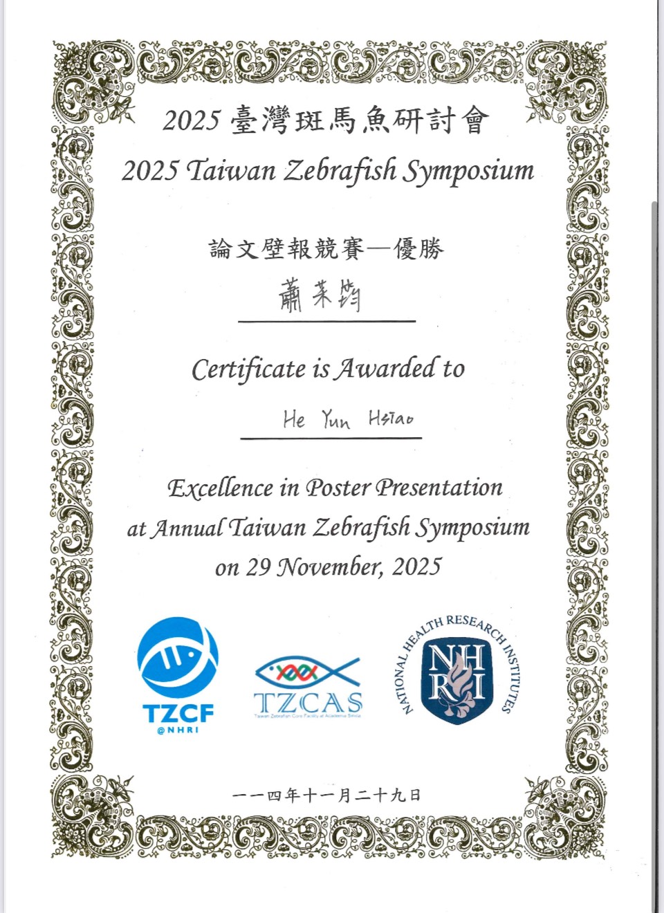 恭喜 清大生技所 蕭䒩筠博士生 及 倪郁慈碩士生 (喻秋華指導教授、汪宏達共同指導教授) 於2025臺灣斑馬魚研討會獲獎: